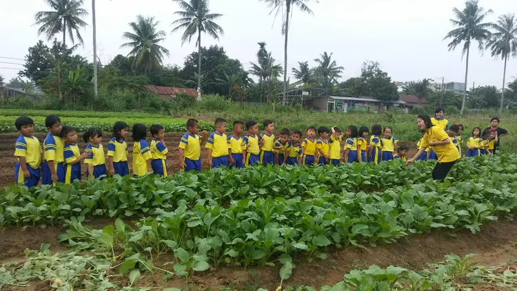 Sesuai dengan tema pembelajaran yaitu tema tanaman sayur-sayuran, anak-anak di ajak berkunjung melihat langsung tanaman sayur di kebun petani yang ada di depan sekolah paud.